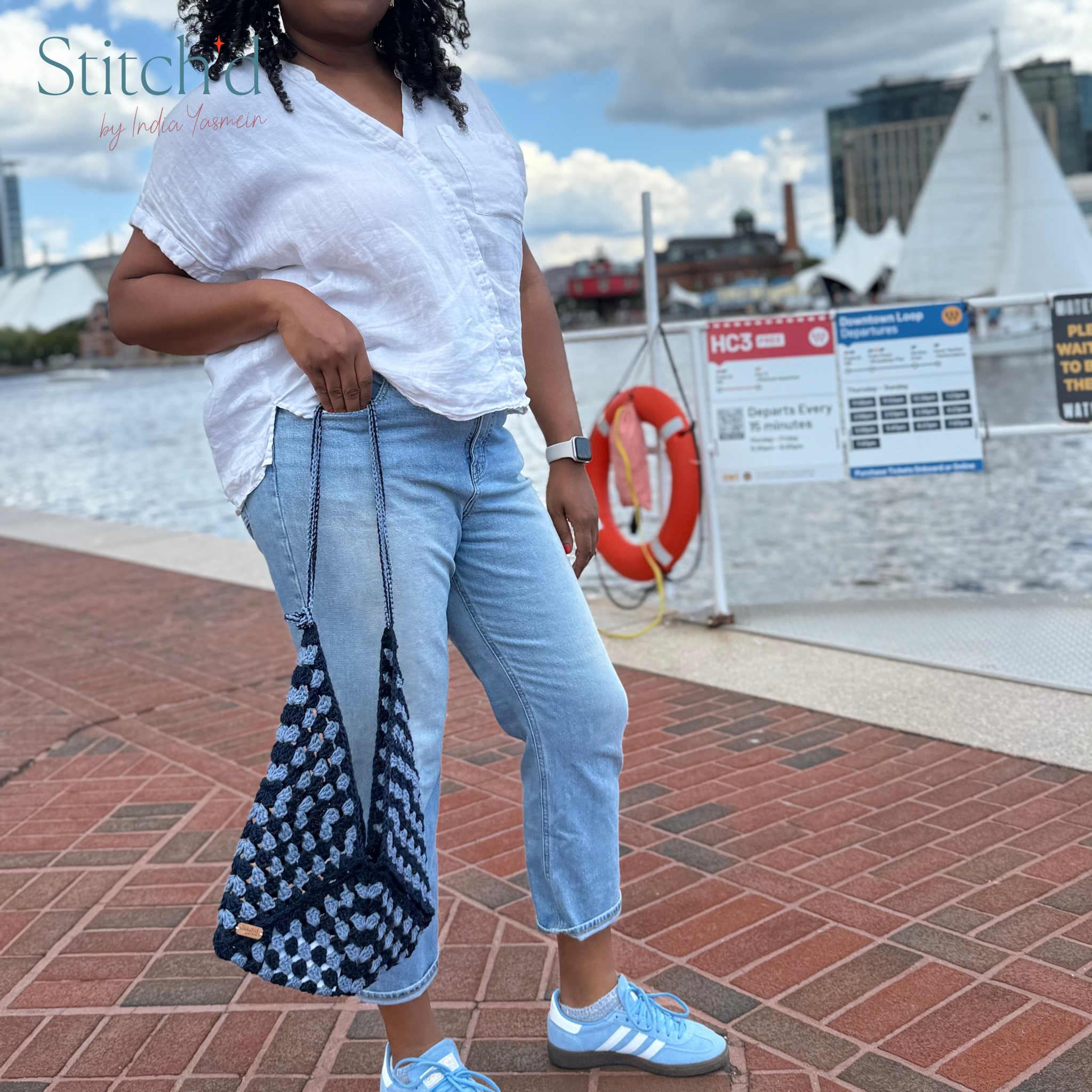 The Flatiron Shoulder Bag is a playful summer essentials companion. Its charming two-tone crochet granny squares bring a touch of retro flair, perfect for your quick errands or a breezy beach day. Lightweight and simple, this bag keeps your hands free and your style effortless #iykyk!