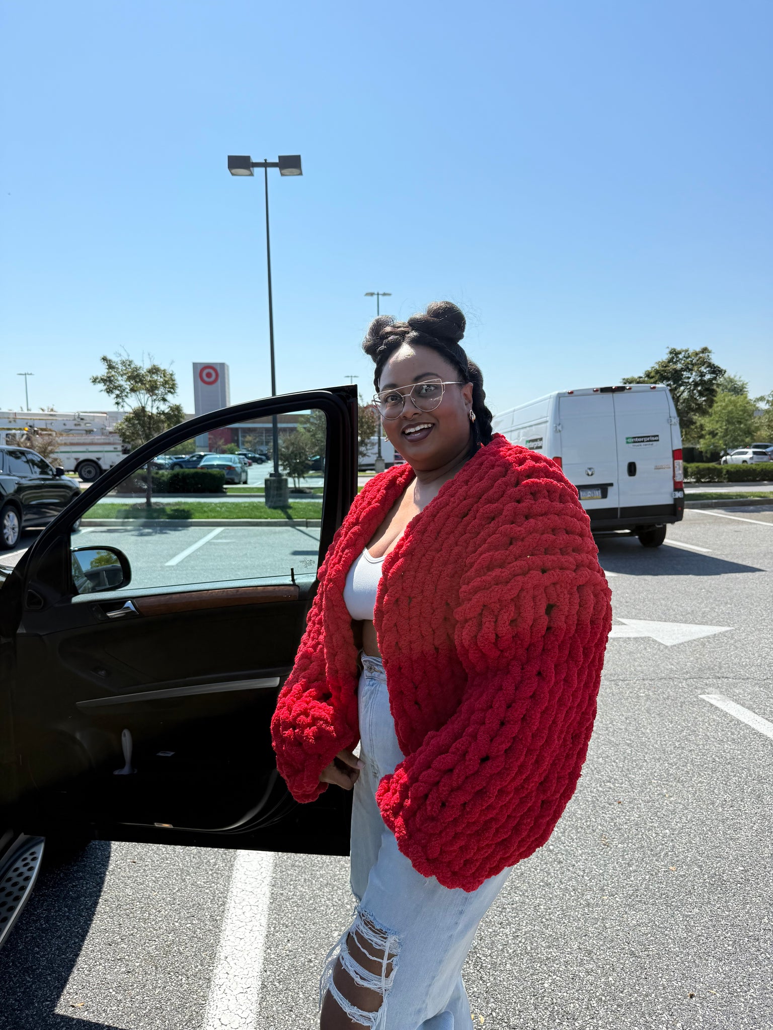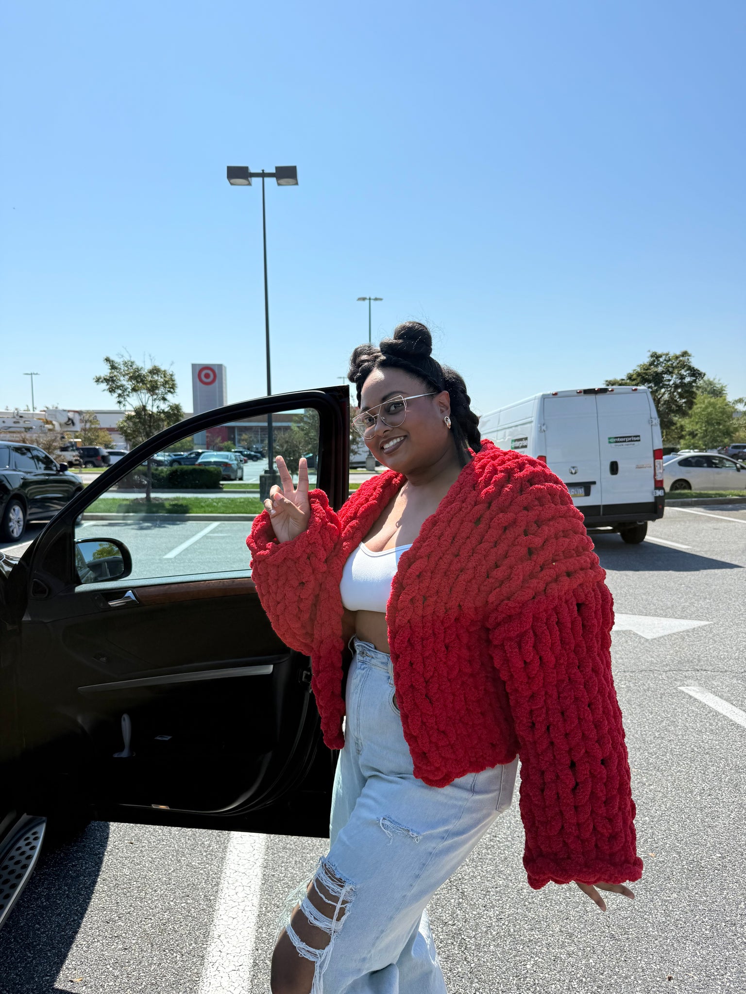 Wrap yourself in bold warmth with this Chunky Blanket Cardigan. Crafted from thick, cozy yarn, it’s the perfect statement piece for fall, blending style and comfort effortlessly. Its vibrant red hue ensures you stand out while staying snug, making it a must-have for those who dare to be different this season.